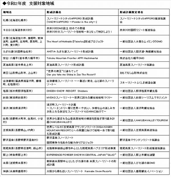 観光庁、スノーリゾート促進事業 支援対象地域18件を選定