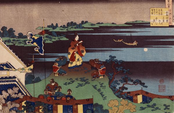 「百人一首うはかゑとき」とは、乳母が子供に百人一首の和歌を一首ずつ絵で解説するために描かれた大判錦絵シリーズ。本図では、安倍仲麻呂が異国の地・唐で月をみたときに、故郷を想い詠んだ歌「天の原ふりさけ見れば春日なる三笠の山に出でし月かも」を絵解きする。