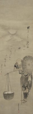 後期の注目作品は、北斎の肉筆画「蛤売り図」。月明かりのもと佇む棒手振が描かれている作品で、上部には、狂歌師による賛が書き込まれている。