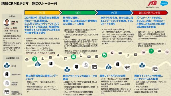 顧客データに基づき、ライフイベントや嗜好に焦点を当てたキャンペーンの実施や特産品の提案が可能となるほか、購買データの蓄積など、横断的なデータ活用が見込める。地域の宿泊施設や観光施設、DMOは、タビ前からタビ後、記念日などの場面で、顧客に合わせたサービスを提案できる。