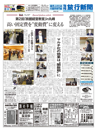 旅行新聞新社(石井貞德社長)とサービス産業革新推進機構(内藤耕代表理事)は10月5、6日の2日間、福島県の「会津芦ノ牧温泉 丸峰」(星保洋社長)で第2回「旅館経営教室」現地セミナー&館内見学会を開いた。「コロナ禍を乗り越える労働生産性改革」をテーマに、旅館・ホテルの経営者や調理長、現場責任者ら21人が参加した。丸峰のデータ化によるサービス能力管理や、マルチタスク化、工学博士の内藤氏の細かな解説とともに、高い固定費を“変動費”に変える業務プロセスの改善の流れを見学した。