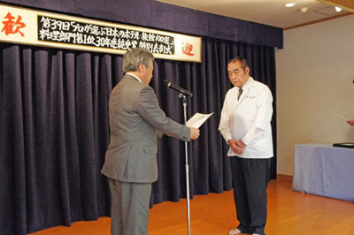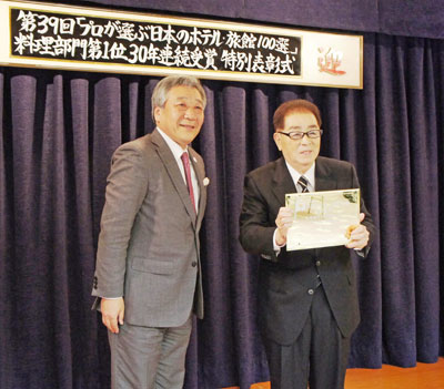 現地ホテルで行われた表彰式では、旅行新聞新社の石井貞徳社長が、ホテル創業者で料理旅館として名を高めた湯通堂保会長に30年連続表彰の盾を贈呈。また、湯通堂会長とともに料理日本一の宿を作り上げた石井正治総料理長に、第39回料理部門第1位の表彰状が贈られた。