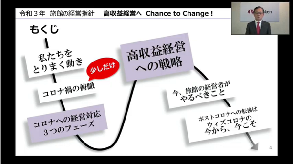 リョケン(佐野洋一社長)は12月10日(木)、「令和3年 旅館の経営指針発表」のオンラインセミナーを開いた。今回は新型コロナウイルスの影響で、従来の「旅館大学セミナー」から変えて、オンラインによるウェビナー形式で開講した。旅館・ホテルの経営者や役員、幹部社員などが参加し、持続性ある「ポストコロナ時代」の旅館経営の在り方を考え、存続価値の再点検と付加価値の幅を広げるビジネスモデルを探った。