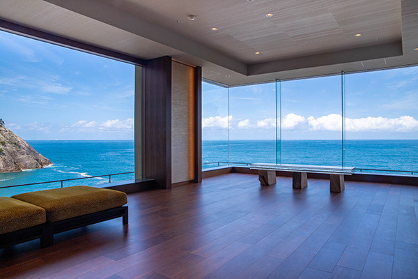 日本海の絶景が広がるラウンジは、床をフローリングに一新し、高級感を創出。ラウンジにあったコンベンションホールの控え室を取り壊し、海に面した「龍宮テラス」を整備した。ガラスのベンチを配置し、絶好の写真スポットとなった。ラウンジではフリードリンクサービスも開始。おもてなし充実と業務効率化をはかった。