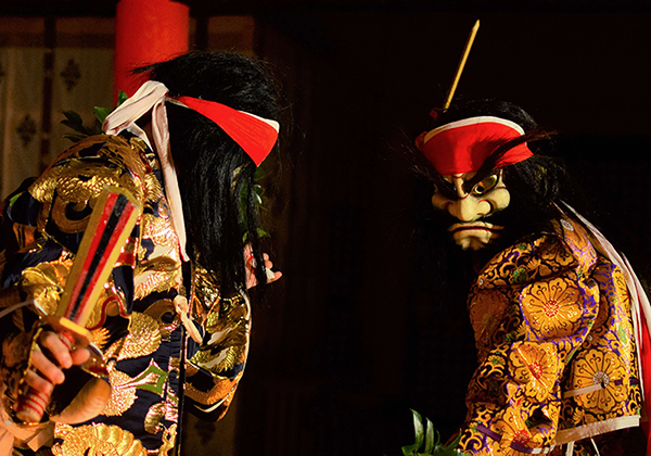 同神社の「日沉宮(ひしずみのみや)」拝殿を舞台に、市内の神楽団が勇壮な舞いを披露する。日没に合わせた時間に上演を始め、美しい夕日が沈んでいく周辺の雰囲気とあいまって、神聖な空気に包まれるという。