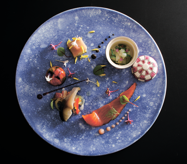 コースは全9品。トリュフを添えたフォアグラのソテーや黒毛和牛ステーキ、パリパリ食感が楽しめる太刀魚のカダイフ揚げ、造り4種盛りのほか、冷製スープや燻製サーモン、サバのマリネなどを空色の丸い大皿に盛り付けたオードブルは、壮大な地球を表現するかのような独創的な一品に仕上げた。