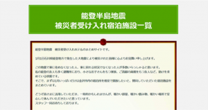 ホテル・旅館 令和6年能登半島地震、避難者受け入れ可能な宿を募集 (石川県) 2024年1月9日(火) 配信 石川県はこのほど、令和6年能登半島地震の避難者の二次避難所として、受け入れ可能な金... 2024.01.09