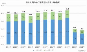 2022年5月6日(金) 配信 観光庁はこのほど、「旅行・観光消費動向調査」の2021年年間値を発表した。21年の...