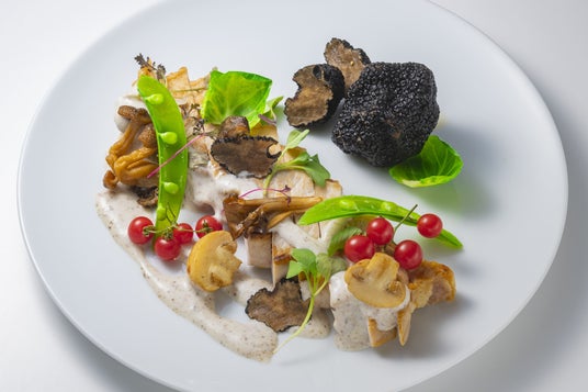・2月:広島県産牡蠣とシラウオのアヒージョ、トリュフとキノコのポークステーキサラダ