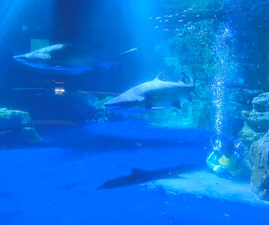 天候や時間帯によって変化する幻想的なシーンの中、頭上をサメが力強く泳ぐ姿や餌を食べる様子などをご覧いただきながら、サメの秘密に迫る「新しい発見」に出会えるかもしれません。