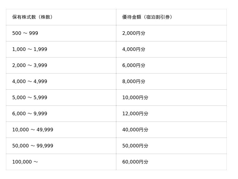 当社の株主優待制度では、2026年3月31日時点の株主名簿に記載または記録されている株主様のうち、保有株式数3,000株以上の株主様を対象に、当社グループが運営する国内のホテルを対象(※)とする宿泊割引券(2,000円券)を保有株式数に応じて贈呈しております。