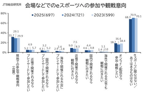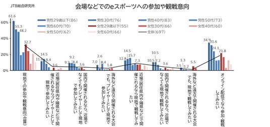 eスポーツを「知っている」と回答した人のうち、実際に現地に出向いてプレイや観戦をする意向については、「関心はない/あてはまるものはない」の割合が昨年度の70.9%から68.3%と減少しており、リアルでのeスポーツへの参加意向は微増で、特に男性29歳以下では61.6%と全体の倍近くの高い割合となりました。また、男性30代では51.3%、男性40代では48.2%、女性29歳以下では32.7%と、比較的高い関心がうかがえます(図8、図9)。