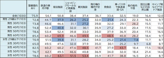 整備してほしい場所で最も割合が高かったのは、「鉄道の車内や駅(54.1%)」、「宿泊施設(50.8%)」、「ショッピングモールなどの商業施設(38.4%)」でした。性年代別には、女性40代は子育て中の人も多いせいか、「車・バス中や高速道路・SA」や「キャンプ場などのアウトドア施設」の割合も比較的高くなっています。