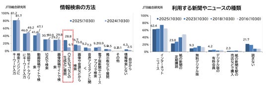 情報検索手段は、生成AIのみが上昇し、昨年の調査で注目された地図アプリや動画投稿も微減に