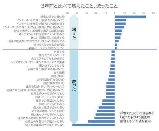 3.生活の中で、3年前と比較して増えたこと、減ったこと:キャッシュレス化やネット購入は一段と浸透。コロナ禍で普及した「会議・ミーティング(オンライン)」は残ったが、「旅行先でのテレワーク」や「シェアオフィス・コワーキングスペースでの業務」、「在宅勤務」などは減少傾向へ