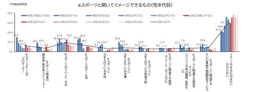 また、男性30代では「eスポーツのゲーム名(28.9%)」、男性40代と女性29歳以下では「eスポーツのイベント、大会(20.5%/25.5%)」が最も高く、男性40代では「eスポーツに力を入れている学校(15.7%)」も上位に来ており、年代・性別毎のeスポーツとの関わり方によって具体的にイメージできるものが異なりました(図10)。