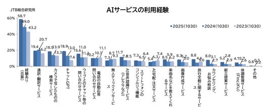 6.AIサービスの利用経験は、58.7%と前年より約10ポイント上昇。旅先で利用してみたいAIサービスは、「旅行先のグルメ情報検索(29.6%)」、「言語翻訳(25.1%)」、「行程・ルート提案(24.7%)」などが上位に。