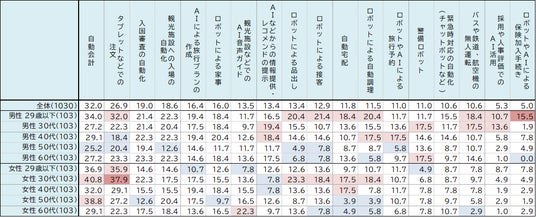 また、AIに限らない「無人サービス」の利用意向については、「自動会計(32.0%)」、「タブレットなどでの注文(26.9%)」、「入国審査の自動化(19.0%)」など、手続きを効率化できるサービスが、「旅行プランの作成(16.4%)」、「音声ガイド(13.5%)」、「レコメンドの提示(13.4%)」などの付加価値サービスを上回りました。性年代別では、29歳以下の男性で、無人サービスの利用意向が全体的に高い傾向がみられます(表3)。