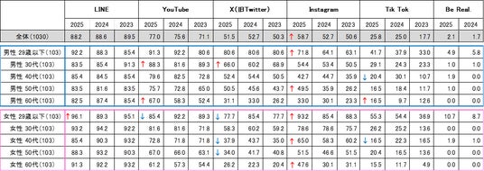 スマートフォンで利用する主なSNSや動画投稿サービスとしては、「LINE」、「YouTube」、「Instagram」、「X」となり、上位の顔ぶれは昨年と変わりませんでしたが、「LINE」と「X」はやや減少し、「Instagram」が「X」を超えて3位となりました。「X」は特に女性の利用率が減少しています。また、リアルな日常を共有できるとZ世代に人気の「BeReal.」もわずかながら上昇し、29歳以下女性の利用率が10%を超えました(表1)。