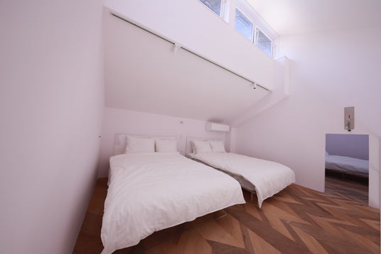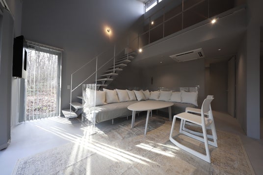 2棟の宿泊棟には、少人数からグループまで、多様な滞在スタイルに対応する全7室の客室をご用意。客室はすべてメゾネットタイプで、2名向けのコンパクトな客室から、最大10名まで泊まれるゆとりある客室まで幅広いタイプを展開します。雪と森を望む落ち着いた空間は、白・グレーなどミニマルながら部屋ごとに異なる表情を持ち、滞在そのものがサウナ体験の余韻を深めます。また、永棟の2つの客室には、ゆとりあるプライベートサウナを備えています。