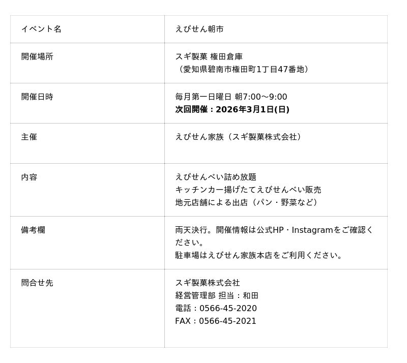 愛知県碧南市で毎月第一日曜日の朝7時から9時まで開催されている「えびせん朝市」が、2026年3月に1周年を迎える。主催は、えびせんべい直売店「えびせん家族」(製造元:スギ製菓株式会社、本社・碧南市)である。