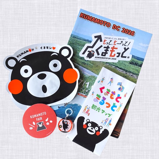 くまモンのフェイスマスク、観光パンフレット(3種)、朝食