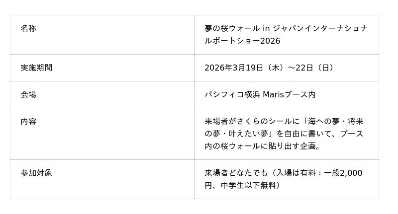 公益財団法人マリンスポーツ財団(以下、Maris)は、4月1日を「夢を語る日」にするプロジェクト「April Dream」(株式会社PR TIMES提唱)のDreamパートナーとして、2026年3月19日(木)~22日(日)に開催される「ジャパンインターナショナルボートショー2026」(会場:パシフィコ横浜)のMarisブース内にて、来場者がさくらのシールに「夢」を書いて貼り出す参加型企画「夢の桜ウォール」を実施します。