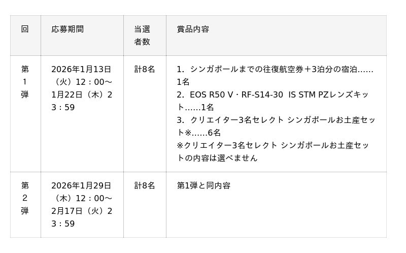 本企画に合わせて、Instagramで応募できるプレゼントキャンペーンを実施します。STB・キヤノンMJ・GENICの公式Instagramアカウントをフォローし、対象投稿にいいね!とコメントをした方の中から、抽選でシンガポール往復航空券&宿泊や「EOS R50 V」などをプレゼントします。キャンペーンは同内容で2回開催し、第1弾は2026年1月13日から1月22日まで、第2弾は1月29日から2月17日まで応募を受け付けます。