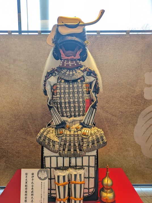 銀伊予礼白糸威胴丸具足(ぎんいよざねしろいとおどしどうまるぐそく)」(模造)