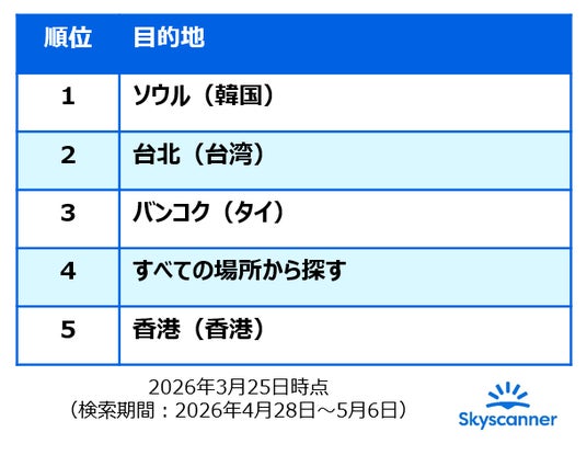 世界中の航空会社・旅行会社・ホテルなど約1,200の旅行パートナーから最適な旅行プランを提供する”グローバル旅行アプリ” Skyscanner Japan株式会社(本社:東京都港区、以下スカイスキャナー)は、2026年ゴールデンウィークにおすすめの旅行先5選を発表しました。