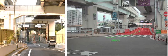 左:首都高 堤通入口/右:制御エリアに入ると加速ができなくなり、自然停止する仕組み
