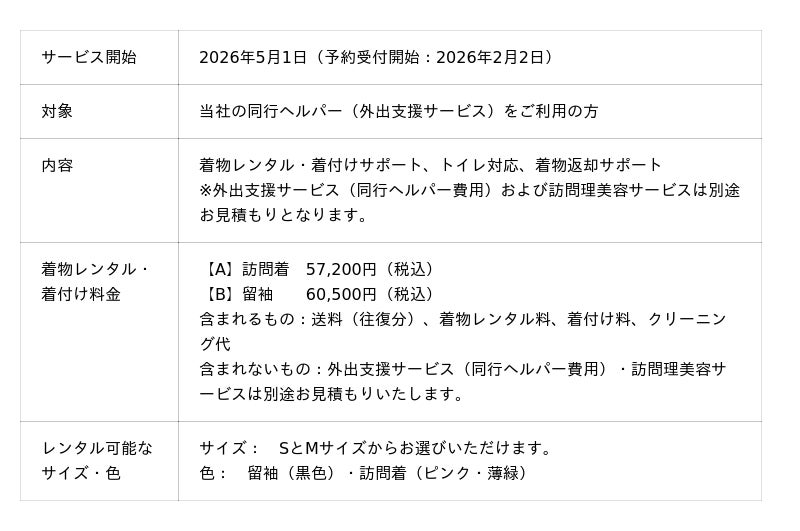 日本介護システム株式会社(本社:大阪市、代表取締役社長:大友俊雄)は、結婚式やご家族のお祝い、記念日など、人生の大切な節目となる一日を、年齢や障害の有無にかかわらず、安心して美しく過ごしていただくための新サービス「カンタン着物レンタル&着付けサポート/同行ヘルパー」を、2026年5月1日より提供開始いたします。