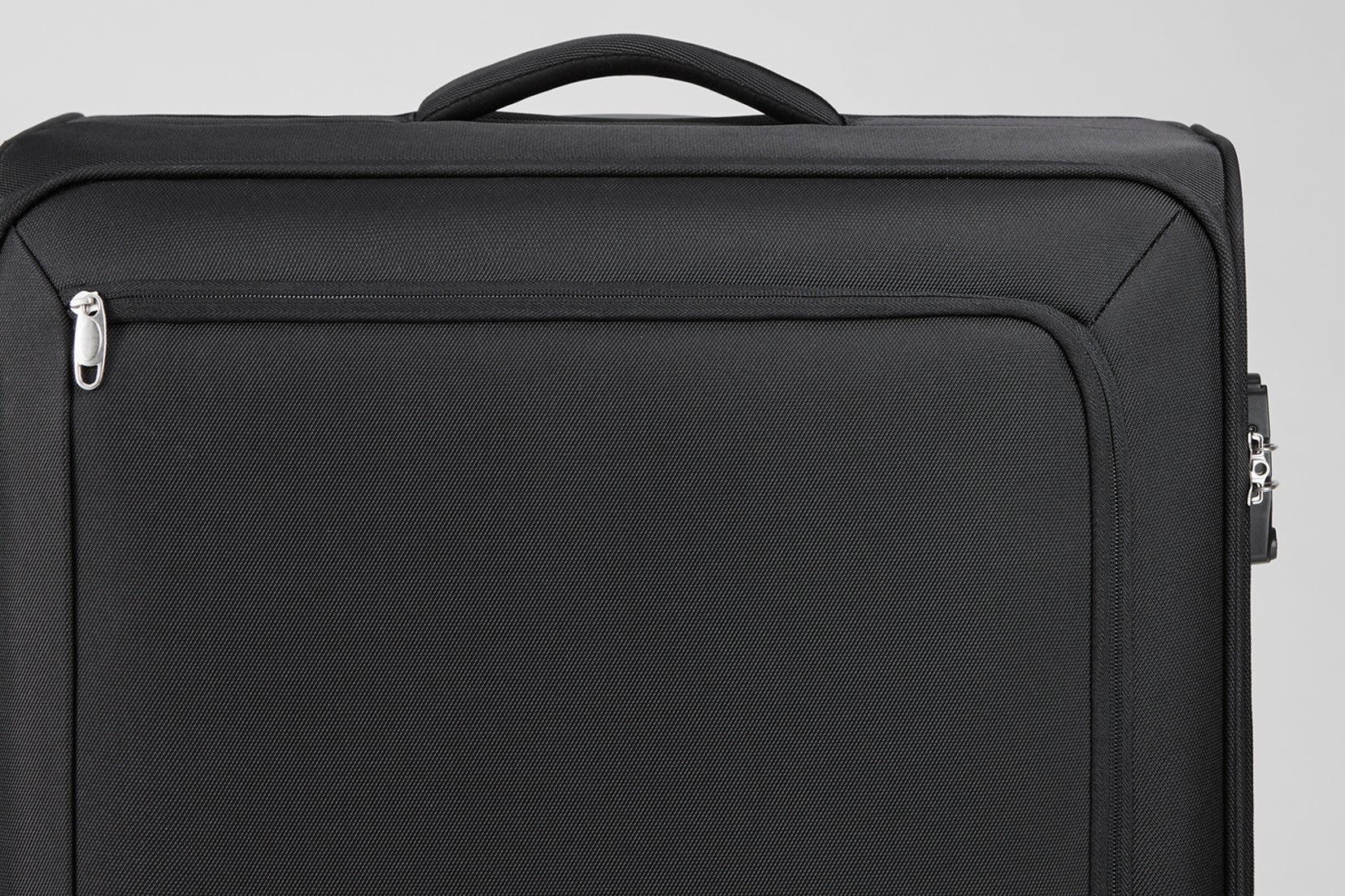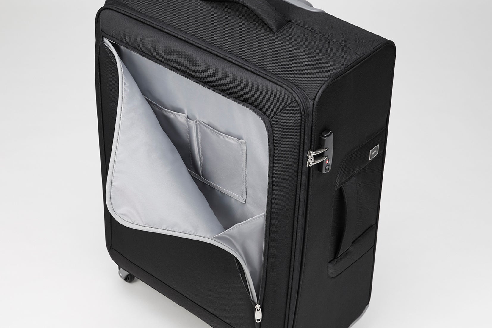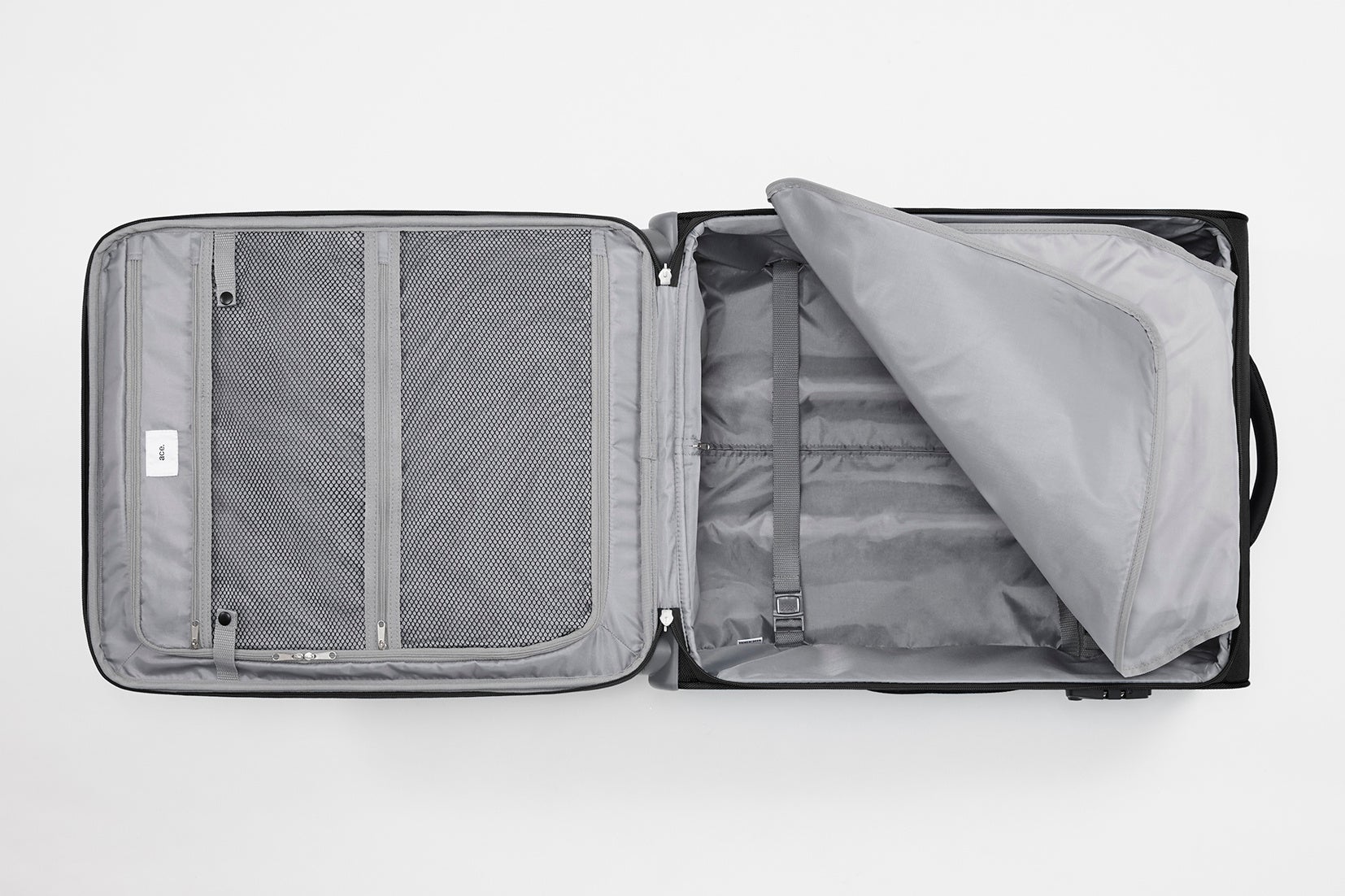 中身が確認しやすいメッシュポケットや荷物を固定するベルトに加え、機内持込サイズ(No.35701)には、移動中に開けても衣類が人目に触れにくい目隠しフラップを備えています。