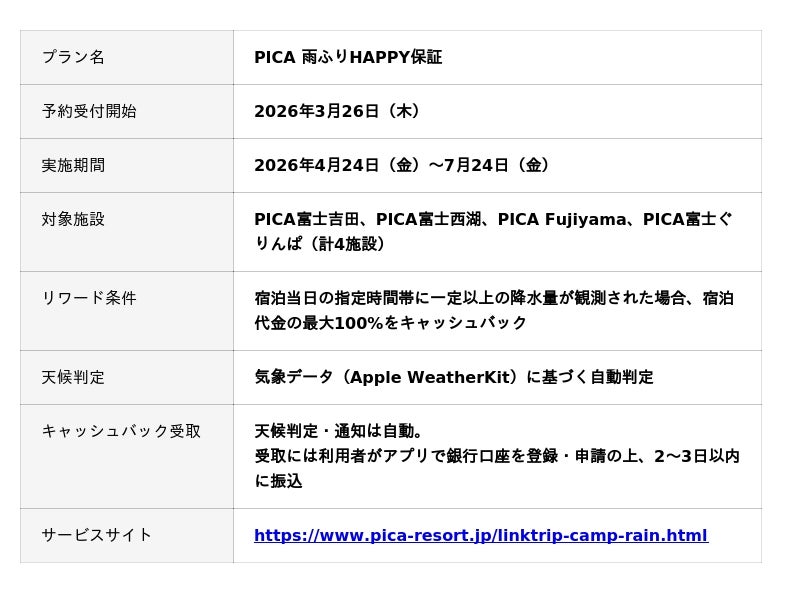 株式会社LinkTrip(本社:東京都渋谷区、社長:橋本啓佑)は、富士急行株式会社(東証プライム上場)のグループ会社である株式会社ピカ(以下「ピカ」)が運営するアウトドアリゾート「PICAリゾート」の4施設において、ジャパン少額短期保険株式会社との連携による「PICA 雨ふりHAPPY保証」を2026年4月より提供開始いたします。