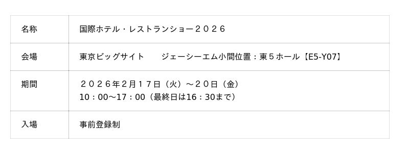 株式会社ジェーシーエム(本社:滋賀県草津市野村6-1-9)は2026年2月に東京ビッグサイト・幕張メッセで開催される「東京ホテル・レストラン・ショー2026」および「スーパーマーケット・トレードショー2026」に出展します。