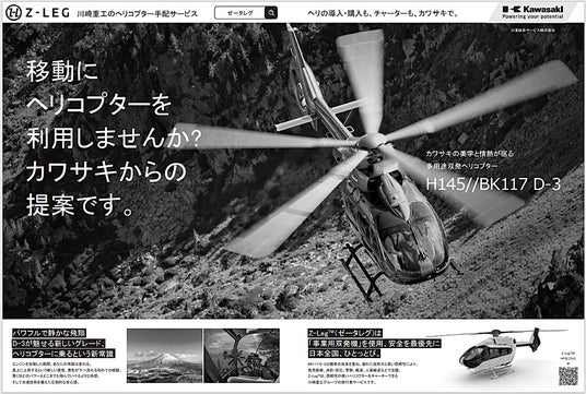 【川崎重工グループ ヘリコプター手配サービス Z-Leg(TM)︎】 移動にヘリコプターを利用しませんか?カワサキからの提案です。 ヘリコプターの導入・購入も、チャーターもカワサキで!