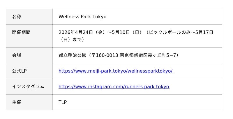 東京建物株式会社(以下「東京建物」)を代表構成団体とし、三井物産株式会社、日本工営都市空間株式会社、西武造園株式会社、株式会社読売広告社、株式会社日テレ アックスオンを構成員とするコンソーシアムが設立したTokyo Legacy Parks株式会社(以下「TLP」)は、ゴールデンウィークを含む2026年4月24日(金)~5月10日(日)(ピックルボールのみ~5月17日(日)まで)の期間、今話題のスポーツが体験できるイベント「Wellness Park Tokyo」を開催します。