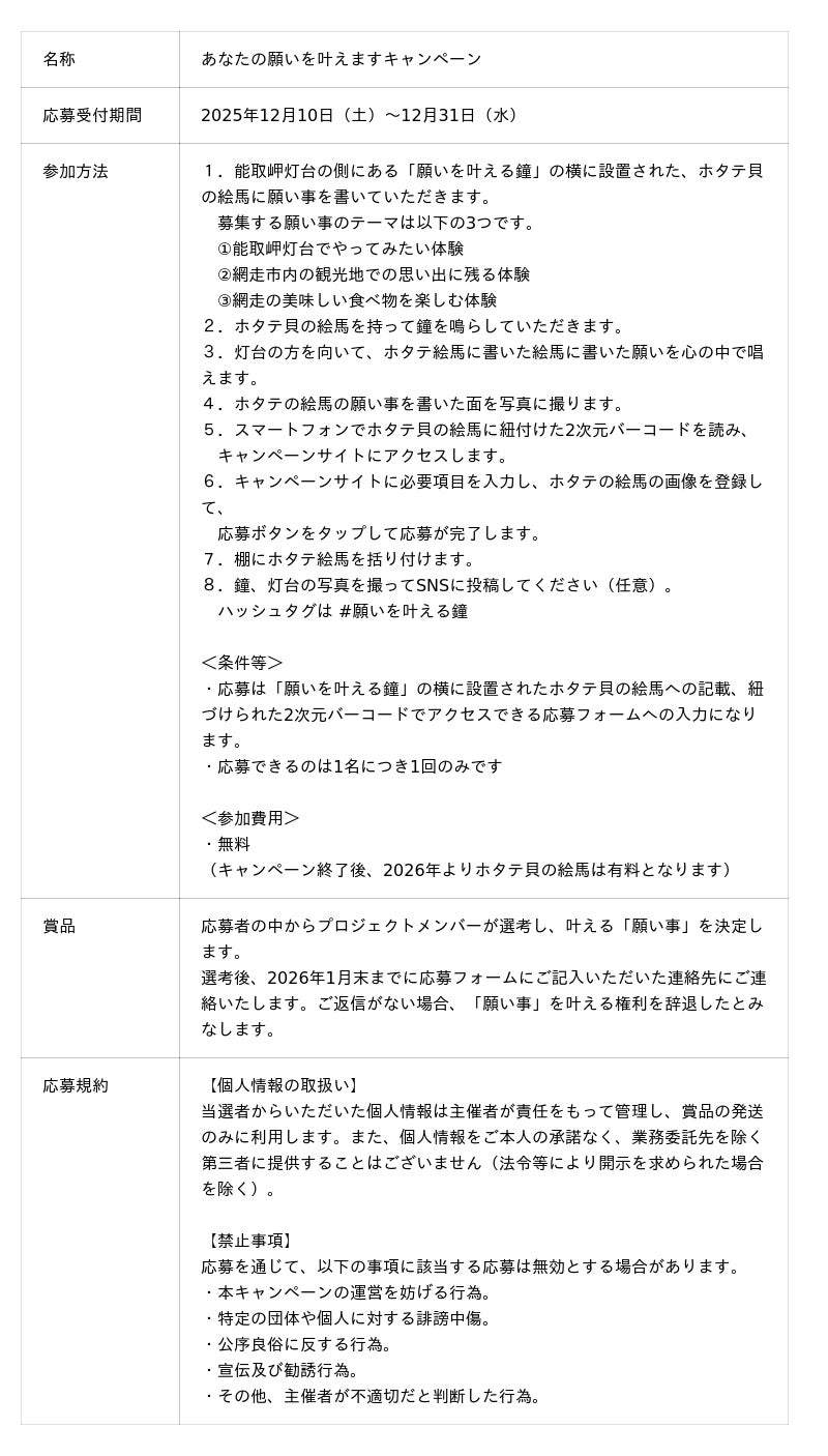 「願いを叶える鐘」の完成を記念して開催する「あなたの願いを叶えますキャンペーン」では、「能取岬灯台や網走市内を舞台にしたやってみたいこと」を募集します。訪れた方がホタテ貝の絵馬に願いを書き、鐘を鳴らしてもらいます。その後、応募者の中から選ばれた方の願いを実現するキャンペーンです。このような取り組みを通じて、能取岬を旅人が願いを唱える特別な場所にしていきます。