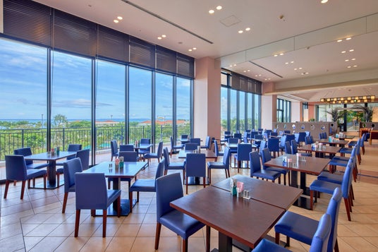 海で遊んだあとは、ホテル内のレストランへ。大きな窓から青い海を眺めながら、リゾートならではのランチメニューを堪能します。海から館内への移動がスムーズなのも魅力です。