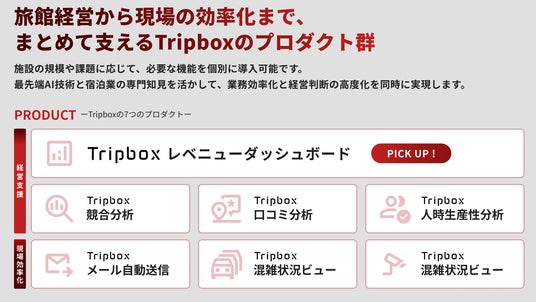 Tripboxは、旅館経営の課題を"見える化"と"自動化"で解決する、7つのプロダクトから成る業務支援プラットフォームです。レベニューマネジメントをはじめ、競合分析、口コミ分析、人時生産性分析、混雑状況ビュー、滞在状況ビュー、メール自動返信(開発中/2026年公開予定)など、施設運営に必要な領域を横断して支援します。各プロダクトは単体導入はもちろん、自由に組み合わせてのご利用やカスタマイズ開発も可能で、旅館ごとの状況に合わせて最適な構成をご提案します。https://trip-box.jp/