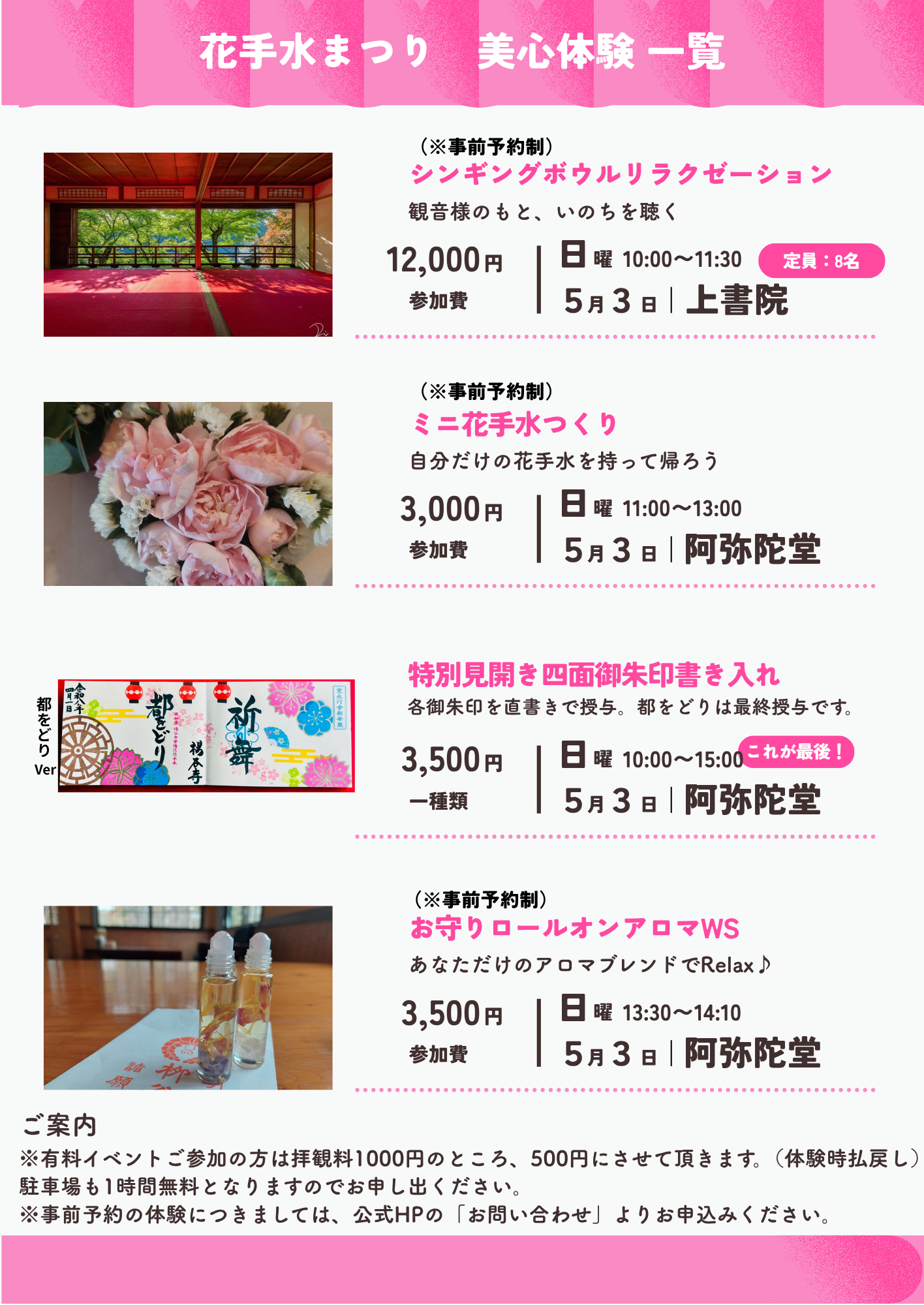 ◎拝観料:拝観料1,000円。(但し、有料イベント参加者は拝観料500円を対象ワークショップより払い戻しの上、駐車場1時間無料)
