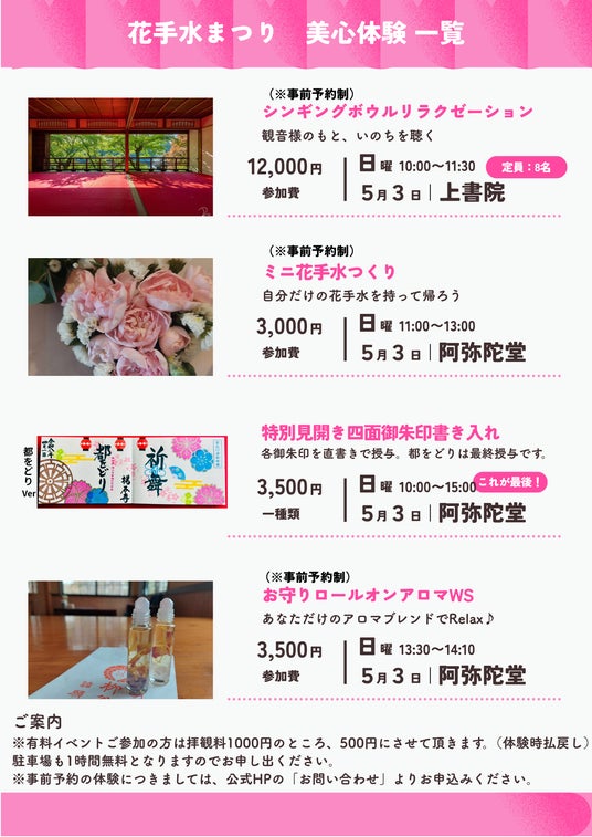 阿弥陀堂では「脈々手水御朱印」、「都をどり御朱印」の四面見開き御朱印2種を、5/3に特別書き入れで授与。なお、都をどり御朱印はこの日が最終受付となります。お求めの方はお早めに!
