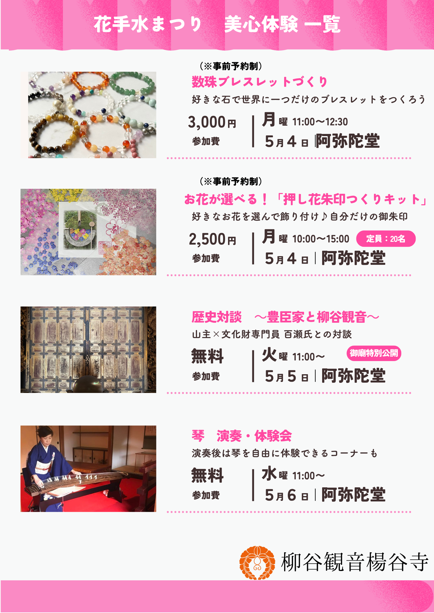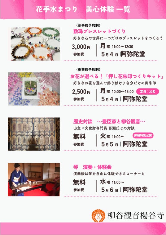 琴やクリスタルボウルの演奏、押し花朱印づくり、数珠ブレスレット作り、オリジナルアロマ作り、ミニ花手水つくりなど、五感を刺激する多彩なコンテンツが日替わりで集結します。