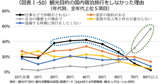 国内旅行は幅広い年代にとって身近な余暇である一方、高齢化の進展とともに「行きたいのに行けない」ギャップが拡大しています。観光庁『令和7年版 観光白書(概要)』によれば、観光目的の国内宿泊旅行をしなかった理由は、20~60代では「休暇がとれない」「家計の制約」等が中心であるのに対し、70代は「自分の健康上の理由で」が31.3%、80代以上では53.0%と、健康要因が突出します。(出典1.)