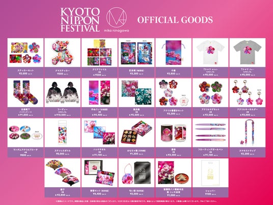 また、会場内特設グッズショップにて、会場でしか手に入らないオリジナルアイテムなど、グッズの販売を複数開始いたしました。手ぬぐいや生八つ橋、おもちゃ箱(菓子折り)などの京都のメーカーとのコラボ商品や、蜷川実花が撮影した北野天満宮の梅の写真がデザインされたオリジナルTシャツ、ポストカードなど、蜷川実花作品の世界観を楽しめるグッズを多数取り揃えています。展覧会での体験の余韻をぜひお家でもお楽しみください。