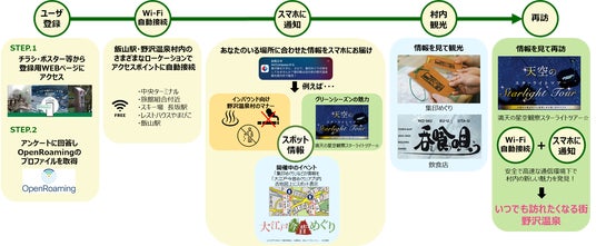 本実証では、野沢温泉村に来訪された方がOpenRoamingを利用してWi-Fiに接続したタイミングで、開催中のイベントや季節のおすすめ情報、観光スポットなどをプッシュ通知でご案内します。