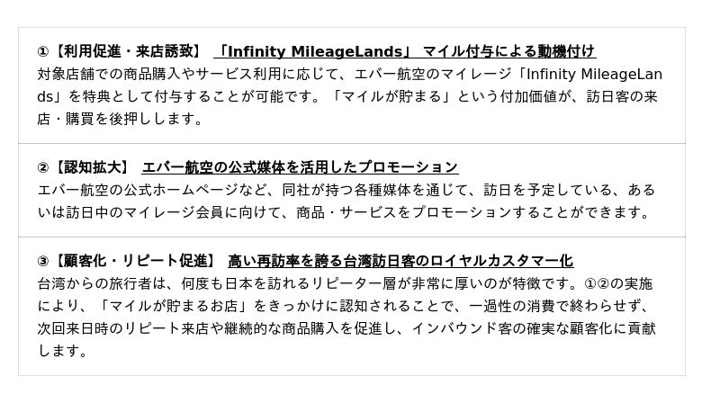 本提携により、インバウンド需要の獲得を目指す国内の事業者に向けた新たな集客・プロモーション支援サービスを実施いたします。これから日本を訪れるエバー航空のマイレージ会員に対し、「認知拡大」と「来店・購買促進」をワンストップで実現するインバウンド特化型の販促サービスです。
