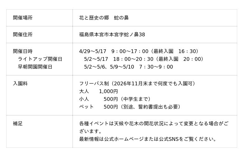 花と歴史の郷 蛇の鼻 [株式会社伊東商事(本社:福島県郡山市 代表取締役:伊東孝弥)]は、「2026ふじ祭り ふくしまDC特別版」を4/29~5/17に開催します。