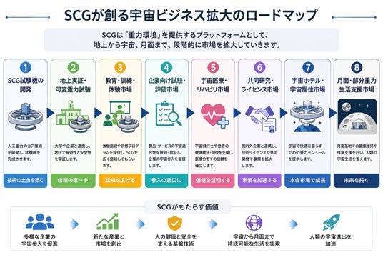 SCGが目指す宇宙ビジネス拡大のロードマップ。地上実証から教育・訓練、企業評価、宇宙医療、共同研究、宇宙ホテル・月面生活支援まで、人工重力技術を基盤に段階的な市場創出を目指します。