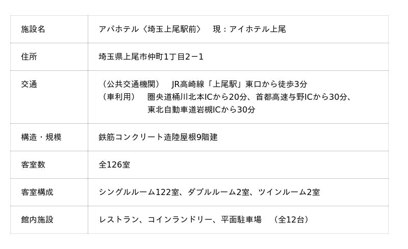 アパホテルネットワークとして1,059ホテル142,943室(建築・設計中、海外、アパ直参画ホテルを含む)を展開するアパホテル株式会社(本社:東京都港区赤坂3丁目2-3 取締役社長:元谷 芙美子)は、株式会社プラチナスペース(本社:埼玉県所沢市東住吉13-5 代表取締役社長:重松 隆)が現運営中のアイホテル上尾を取得、当社とフランチャイズ契約を締結し、埼玉県上尾市にアパホテル〈埼玉上尾駅前〉を2026年6月に開業(予定)することに合意した。